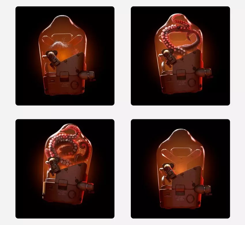 Auf einem davon sind Partikel unbekannter Materie zu sehen, auf den anderen beiden ein Oktopus und der vierte Kolben ist leer. All dies bedeutet eindeutig etwas, aber was genau, ist noch ein Rätsel.