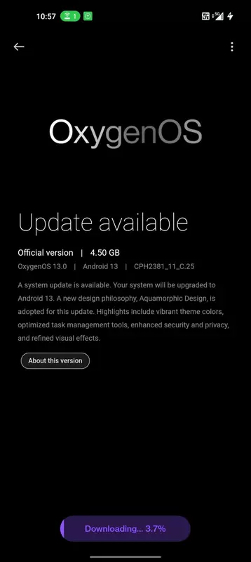 Die Firmware bringt die proprietäre OxygenOS 13-Oberfläche und einen Dezember-Sicherheitspatch mit. Sie wiegt eine Menge - 4,5 GB. Nach der Installation wird die Softwareversion CPH2381_11_C.25 verwendet.