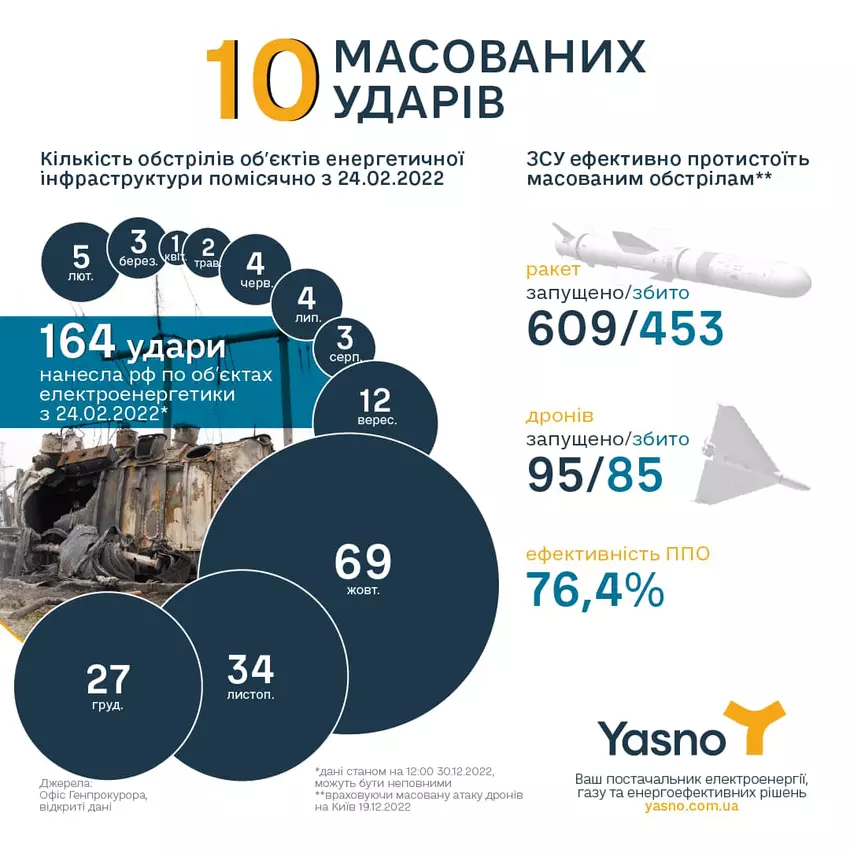 Die ukrainischen Luftverteidigungskräfte haben Angriffe auf die Energieinfrastruktur mit einer Effizienz von mehr als 75 % abgewehrt. Die YASNO-Statistiken beziehen sich auf den Zeitraum vom 24. Februar bis zum 30. Dezember 2022.