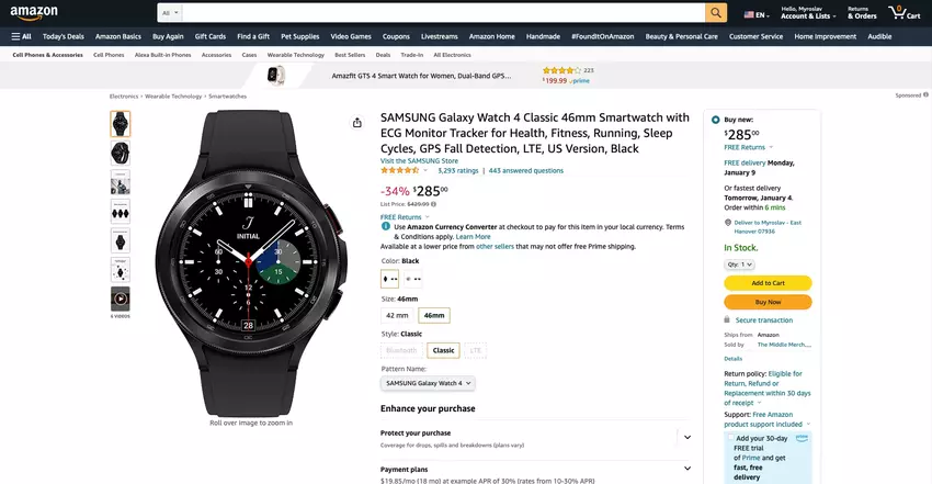 Samsung Galaxy Watch 4 Classic mit EKG-Sensor, IP68-Schutz, Wear OS und 46mm-Gehäuse im Angebot bei Amazon für $144 off