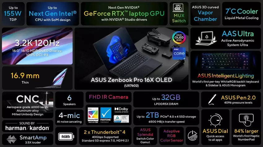 Das ASUS Zenbook Pro 16X OLED verfügt über sechs Harman/Kardon-Lautsprecher, eine Full-HD-Kamera, bis zu 32 GB LPDDR5X RAM und einen 2 TB PCIe 4.0 SSD-Speicher in der Top-End-Version. Die Dicke des Gehäuses beträgt 16,9 mm.