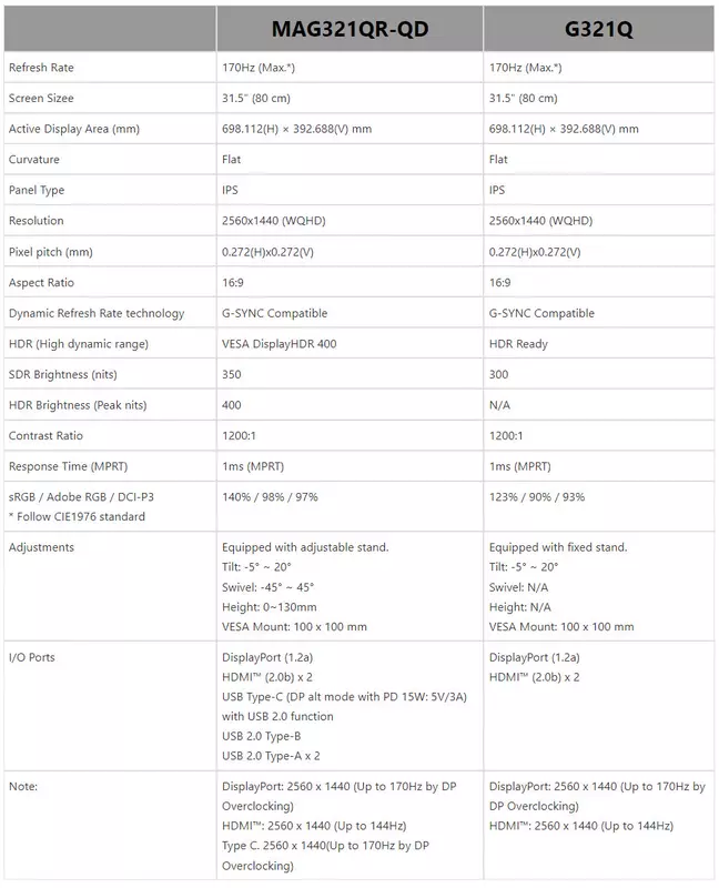 Das zweite neue Produkt von MSI hat die Katalognummer G321Q. Es unterstützt kein VESA HDR und die Helligkeit im SDR-Modus ist auf 300 nits in der Spitze reduziert. Die Abdeckung der sRGB-, Adobe RGB- und DCI-P3-Farbbereiche beträgt 123%, 90% bzw. 93%. Der Monitor ist auch ohne Quantum-Dot-Panel erhältlich. Weitere Details zu den Parametern der beiden neuen Produkte können Sie dem Bild unten entnehmen.