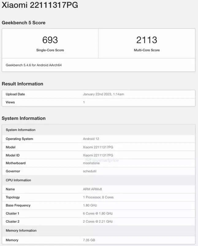 Unsere Kollegen von MySmartPrice haben das POCO X5 in der Geekbench-Leistungstest-Datenbank entdeckt. Die Neuheit läuft unter der Modellnummer 22111317PG. Das Gerät wird mit einem Qualcomm Snapdragon 695-Prozessor, 8 GB RAM und einem Android 13-Betriebssystem ausgestattet sein.