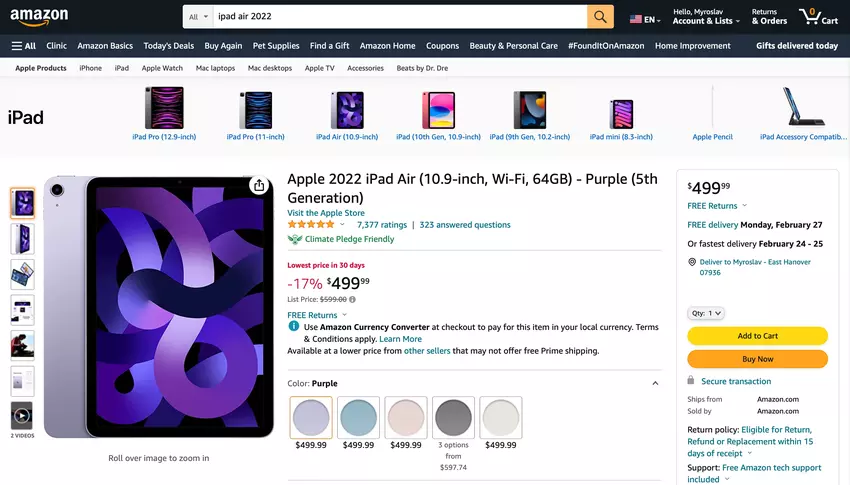 Es handelt sich um das iPad Air der 5. Generation. Es ist bei Amazon für check price on amazon erhältlich, 599,00 $, -17%.