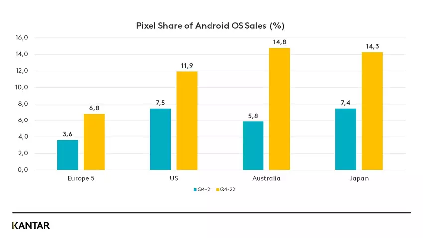 Die Einwohner Großbritanniens, Japans und Australiens kaufen im Vergleich zu den Android-Modellen anderer Unternehmen am ehesten Google-Smartphones. So stieg beispielsweise der Anteil des Pixel in Australien im Laufe des Jahres von 5,8 % auf 14,8 % und in Japan von 7,4 % auf 14,3 %. In Großbritannien kontrollierte Google 18 % des Android-Smartphone-Marktes.