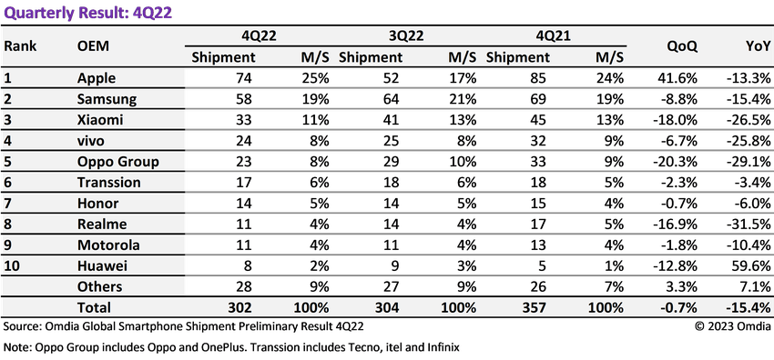 Insgesamt wurden zwischen Oktober und Dezember 302 Millionen Smartphones verkauft. Dies ist das Niveau des dritten Quartals 2022 (304 Millionen Geräte). Im Vergleich zum letzten Quartal 2021 (357 Millionen Geräte) sind die Lieferungen um 15,4 % gesunken.