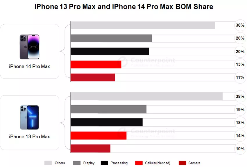 Der Hauptgrund für den Preisanstieg war der Apple A16 Bionic Mobilprozessor. Sein Preis stieg um 11 Dollar. Der Chip ist eine der Komponenten, die Apple selbst entwickelt. Ihr Anteil an den Warenkosten beträgt 22 %. Nur 1 % Preiserhöhung gab es bei der Kamera, die mit einem 48-MP-Sony-Sensor und einer Sunny Optical-Optik ausgestattet ist.