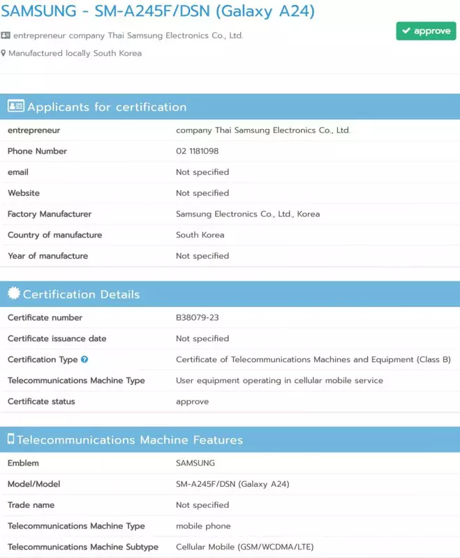 Das Galaxy A24 mit der Modellnummer SM-A245F/DSN hat die NBTC-Zertifizierung in Thailand bestanden. Daher wird das Gerät in naher Zukunft angekündigt werden. Vielleicht wird die Neuheit auf dem MWC 2023 gezeigt, der Ende Februar in Barcelona stattfindet.