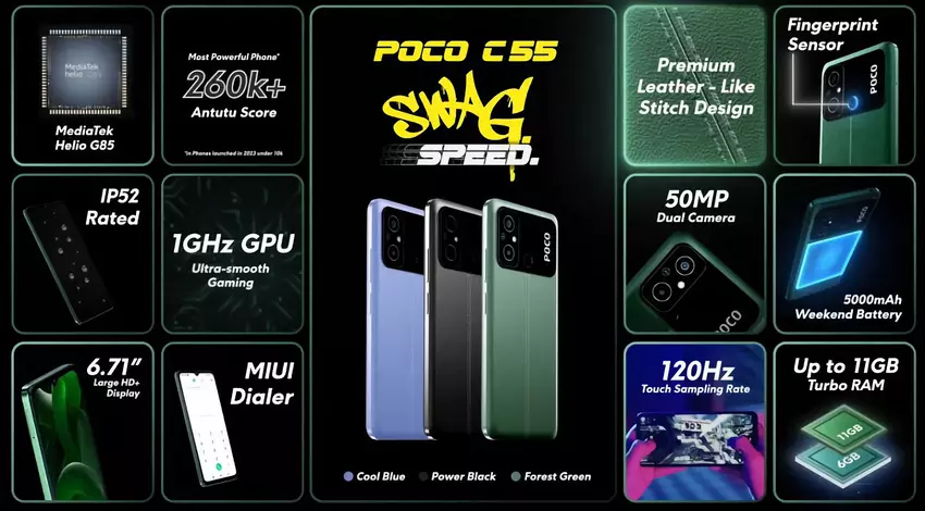 POCO C55: 6,71″ Display, MediaTek Helio G85 Prozessor, IP52 Schutz und 5000mAh Akku für $115