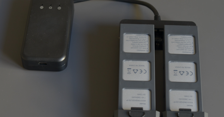 Die Tasche enthält die Drohne selbst, eine Fernbedienung, eine Anleitung, Ersatzschrauben, einen Schraubenzieher und zwei Akkus mit Ladegeräten.