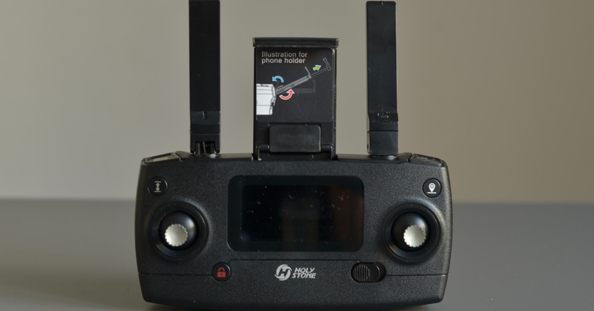 Die Drohne verfügt über ein sehr praktisches Display, das grundlegende Informationen über die Drohne anzeigt. Zwischen den Antennen befindet sich eine praktische Handyhalterung. An den Seiten befinden sich außerdem Räder zum Einstellen des Zooms und des Aufnahmewinkels.