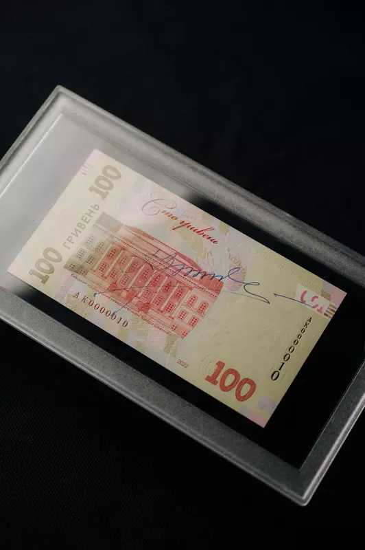 • 7 100-UAH-Banknoten mit einzigartigen Seriennummern und der Unterschrift des Präsidenten der Nationalbank Andriy Pyshnyy.