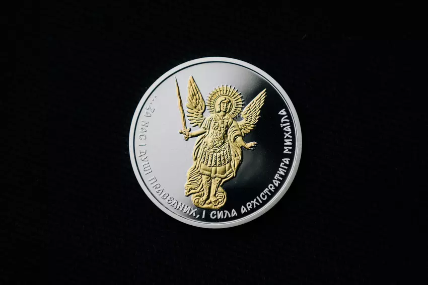 • 13 Silbermünzen "Archistratigus Michael" mit den Unterschriften eines der Kommandeure der Streitkräfte der Ukraine: Oberbefehlshaber der AFU Valery Zaluzhny, Kommandeur der AFU Bodentruppen Oleksandr Syrsky und Kommandeur der AFU Luftstreitkräfte Mykola Oleshchuk.