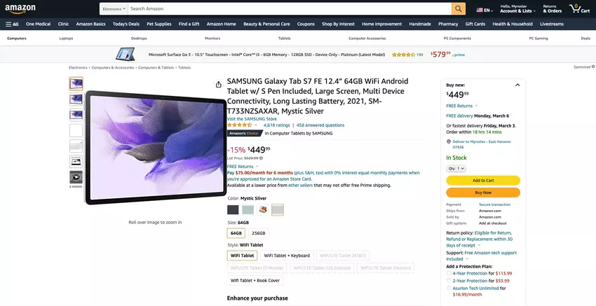 Die Rede ist vom Samsung Galaxy Tab S7 FE Tablet, das 2021 auf den Markt kommt. Das Gerät wird auf Amazon in zwei Speichermodifikationen zu einem reduzierten Preis verkauft: