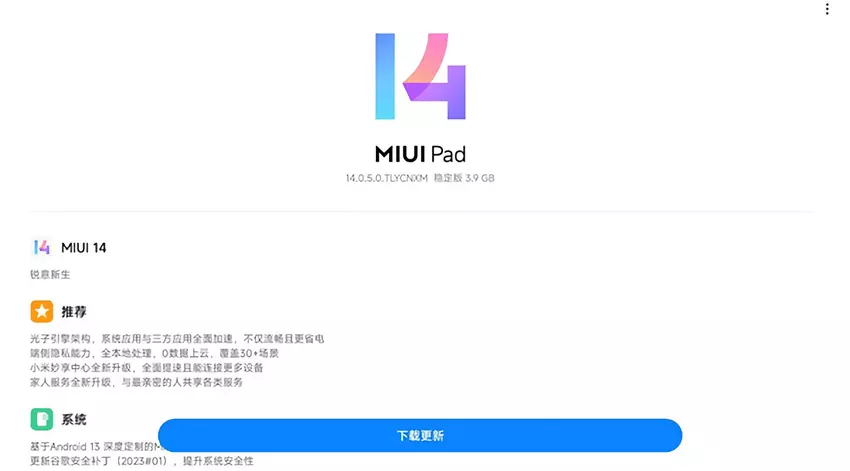Das Update wurde mit der Buildnummer 14.0.5.0.TLYCNXM veröffentlicht und wiegt fast 4 GB. Die Firmware hat den Google-Sicherheitspatch vom Januar sowie alle wichtigen Funktionen von MIUI 14 erhalten, wie zum Beispiel eine aktualisierte Oberfläche und neue Funktionen. Die Entwickler haben auch die Systemleistung verbessert und den Stromverbrauch des Tablets reduziert.
