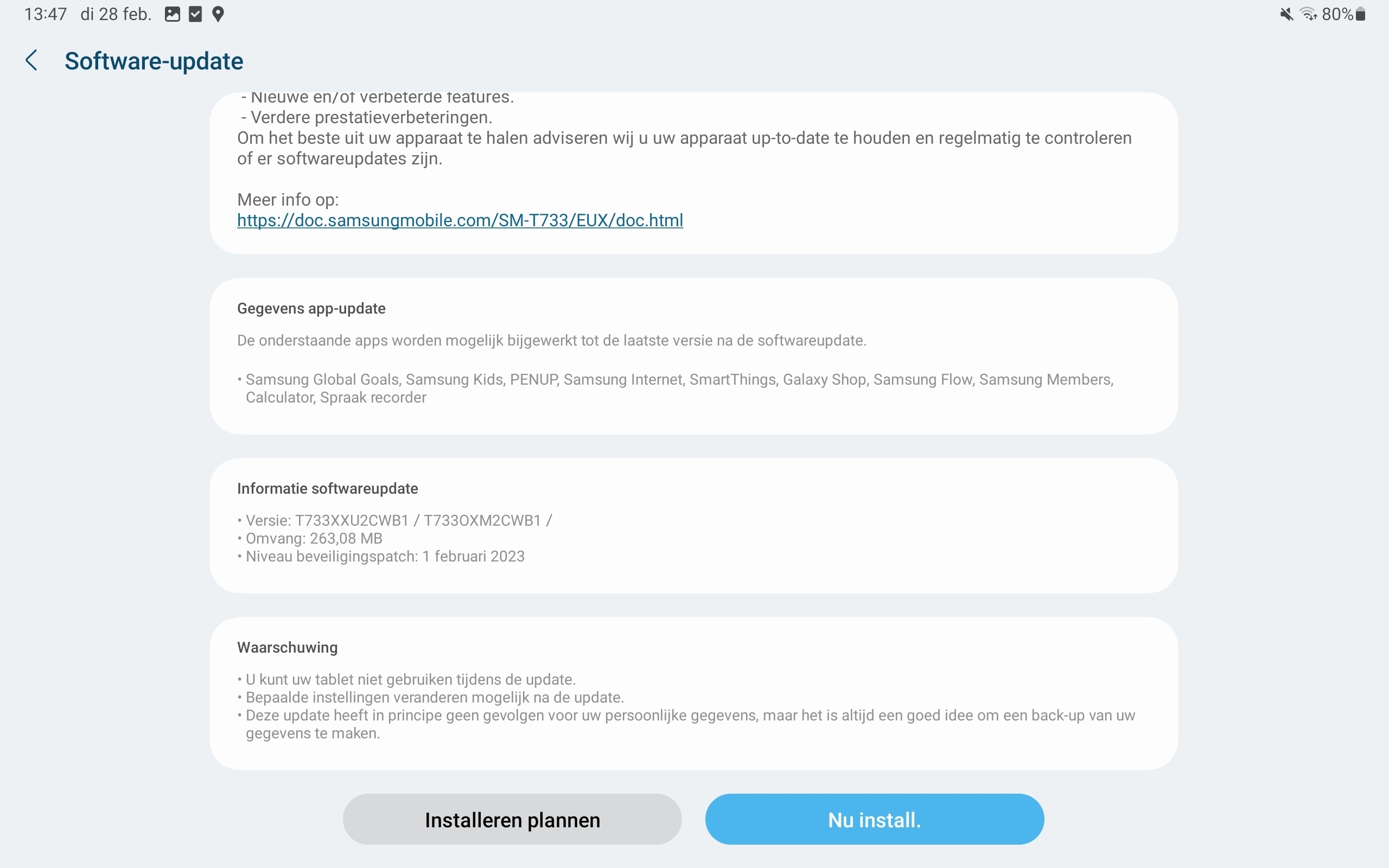 Die Firmware wurde mit der Build-Nummer T733XXU2CWB1 veröffentlicht und wiegt 263 MB. Leider handelt es sich noch nicht um One UI 5.1, sondern nur um ein Sicherheitsupdate. Die Entwickler haben den Google-Patch vom Februar auf dem System installiert, der viele Sicherheitslücken schließt. Außerdem wurden Fehler behoben, an der Systemoptimierung gearbeitet und proprietäre Apps aktualisiert.