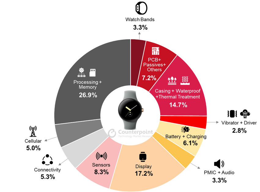 Zwei Prozessoren und ein integrierter Speicherchip machen den größten Teil dieses Betrags aus - sie kosten 33,21 US-Dollar. Das Display kostet 21,16 $, Mobilfunkkomponenten 6,15 $ und andere konnektivitätsbezogene Komponenten etwa 7 $. Sensoren, die Gesundheitsindikatoren erfassen, kosten Google insgesamt 10,21 $. Weitere 18,08 Dollar fallen für das Gehäuse, den Wasserschutz und die Wärmebehandlung an.