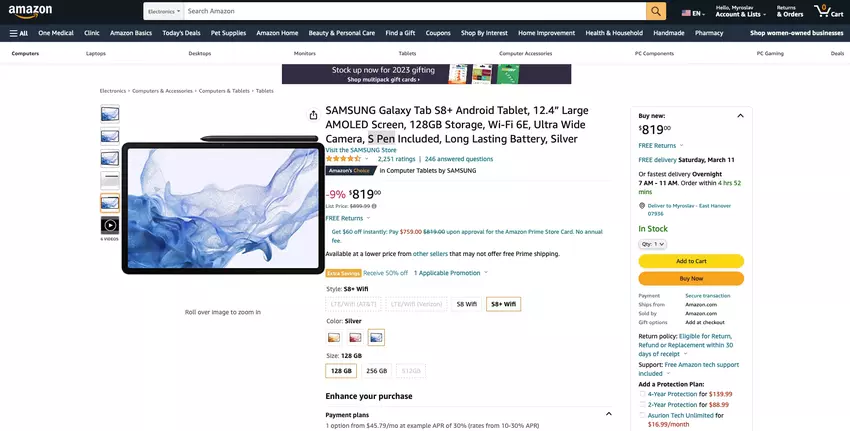 Samsung Galaxy Tab S8+ mit 12,4-Zoll-Bildschirm, Snapdragon 8 Gen 1-Chip und DeX-Modus-Unterstützung ist auf Amazon für $ 50 Rabatt zu verkaufen