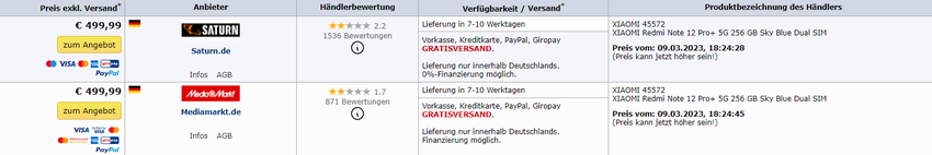 Das Redmi Note 12 Pro+ wird das teuerste Smartphone in der Geschichte der Redmi Note-Serie sein. Die Version mit 8 GB RAM und 256 GB Speicher ist auf den Websites der deutschen Shops MediaMarkt und Saturn aufgetaucht. Das Smartphone kostet 500 Euro. Auch bei Amazon ist das Modell aufgetaucht, allerdings ist der Preis auf 520 Euro gestiegen.