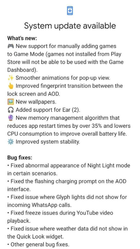 Das Smartphone erhielt außerdem die Möglichkeit, Spiele manuell zum Spielemodus hinzuzufügen, flüssigere Animationen, eine verbesserte Leistung des Fingerabdruckscanners während des Always-On-Displays und ein neues Hintergrundbild. Die Entwickler haben außerdem Unterstützung für die neuen TWS Ear (2) Kopfhörer hinzugefügt. Sie werden am 22. März verfügbar sein.