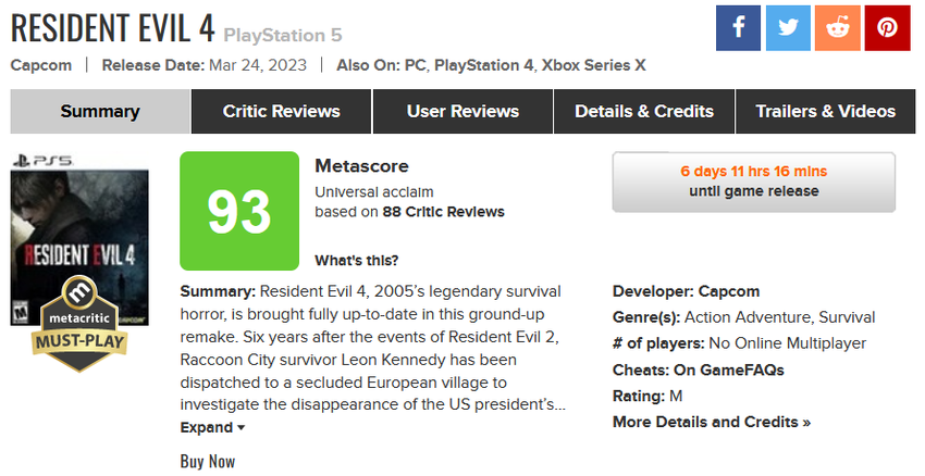 Das Remake von Resident Evil 4 wird am 24. März veröffentlicht, und die Kritiker haben bereits ihre ersten Kritiken veröffentlicht. Auf Metacritic erhielt das Spiel 93 von 100 Punkten und wurde in die "Must-play"-Liste aufgenommen.