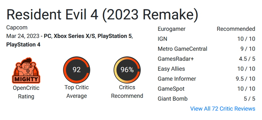 Auf einem anderen Aggregator, Opencritic, erhielt Resident Evil 4 92 von 100 Punkten, und 96 % der Kritiker empfehlen das Spiel weiter.
