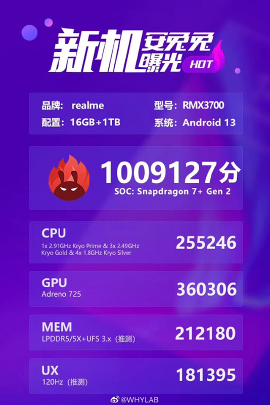 Die Benchmark-Datenbank zeigt, dass das realme GT Neo 5 SE mit 16 GB RAM, einem Snapdragon 7+ Gen 2 Chip und 1 TB Speicher ausgestattet ist. Das Smartphone wird außerdem ein 120Hz-Display mit einer Auflösung von 2772 x 1240 Pixeln, eine 64MP-Kamera und Android 13 erhalten.