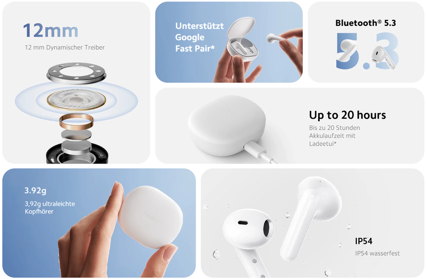 Die Redmi Buds 4 Lite sind mit 12-mm-Treibern ausgestattet. Das Gehäuse jedes Kopfhörers ist nach IP54 wasserdicht. Ohne Aufladen funktioniert die Neuheit 5 Stunden lang, mit dem mitgelieferten Etui 20 Stunden. Für die Verbindung mit Smartphones wird das Bluetooth 5.3-Protokoll verwendet.