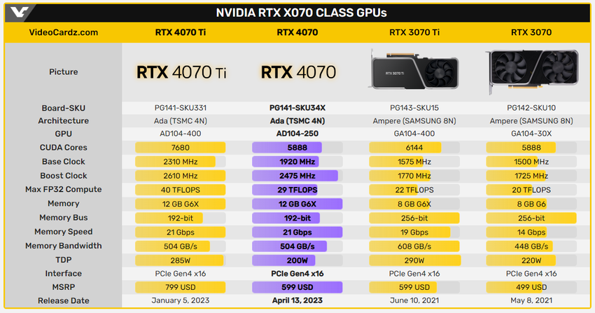 Die GeForce RTX 4070 wird einen AD104-250-GPU-Chip mit 5.888 Stream-Prozessoren haben und mit 1.920 MHz bis 2.475 MHz getaktet sein. Die Leistung wird 29 TFLOPS betragen.