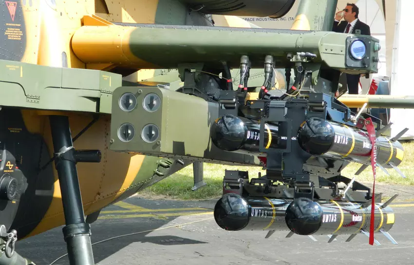 Der T129 ATAK ist ein Kampfhubschrauber, der mit drei 20-mm-Kanonen in der Nase ausgestattet ist. Er kann ungelenkte Roketsan CİRİT, AIM-92 Stinger, Mistral, AIM-9 Sidewinder, AGM-114 Hellfire, BGM-71 TOW, Hydra 70, Spike-ER, UMTAS und OMTAS tragen.