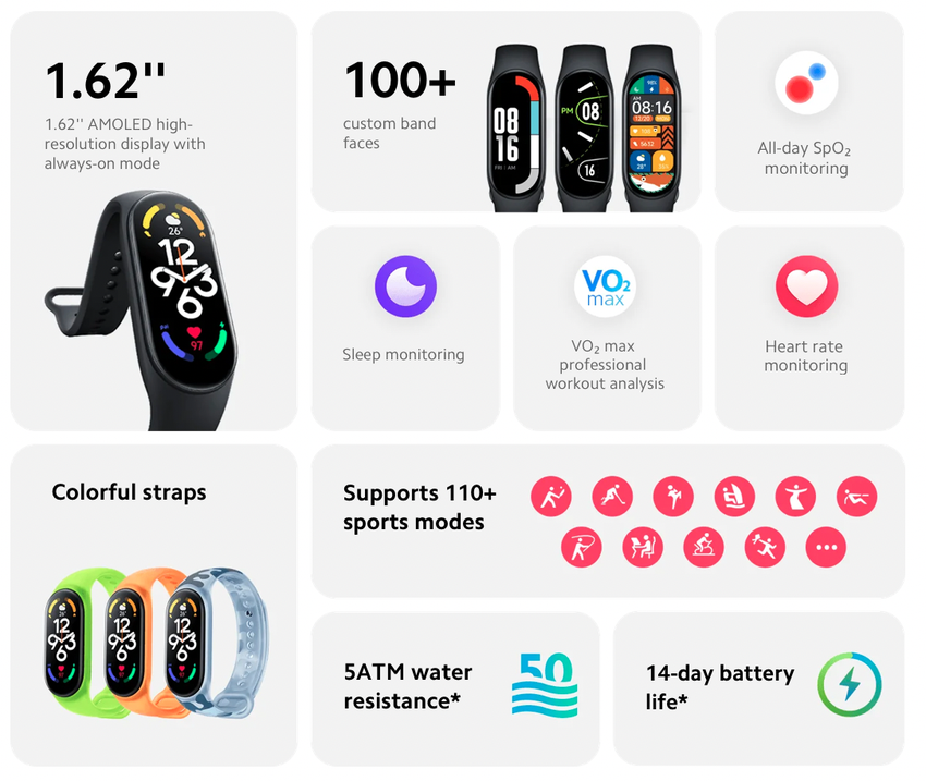 An den anderen Spezifikationen des Armbands hat sich nichts geändert. Das Gerät verfügt über ein 1,62 Zoll großes AMOLED-Display mit einer Auflösung von 490×192p, einer Pixeldichte von 326 ppi und Always-On-Display-Funktion. Das Armband unterstützt 120 Sportmodi. Das Gerät verfügt über einen Herzfrequenzmesser, einen SpO2-Sensor sowie eine Funktion zur Überwachung von Schlaf und Menstruationszyklus.