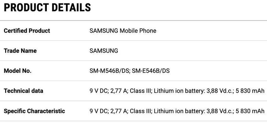 Das Modell ist in der Datenbank einer indischen Regulierungsbehörde aufgetaucht. Das Smartphone hat die Modellnummer SM-E546B/DS und einen 5830-mAh-Akku erhalten. Das bedeutet, dass die Batteriekapazität der kommerziellen Version des Geräts 6000 mAh betragen wird. Die Schnellladekapazität beträgt 25W.