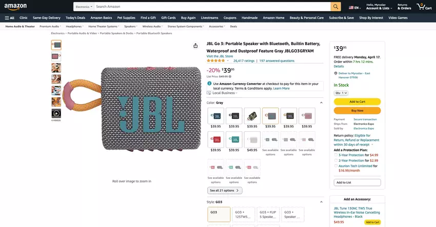 Die Rede ist von dem Modell JBL Go 3. Sie können den Lautsprecher jetzt für $39.99 kaufen $39.99 Rabatt. Es sind viele verschiedene Farben erhältlich. Das Gerät hat ein gummiertes Gehäuse mit IP67 Wasser- und Staubschutz sowie ein Bluetooth 5.1 Modul.