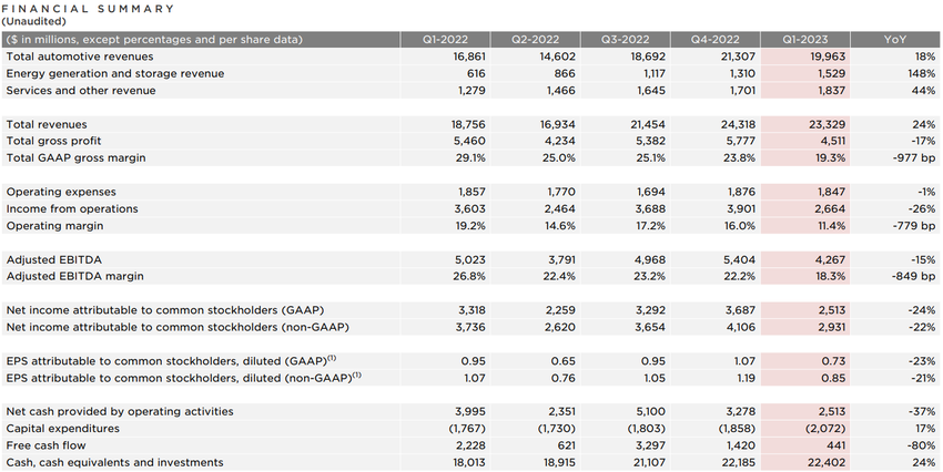 Der Anstieg der Verkaufszahlen führte natürlich auch zu einem Anstieg der Einnahmen. So stiegen die Einnahmen von Tesla im ersten Quartal um 24 % gegenüber dem gleichen Zeitraum im Jahr 2022 auf 23,3 Milliarden US-Dollar. Außerdem hat das Unternehmen eine Gewinnmarge von 19,3 %, was einen Marktrekord darstellt.
