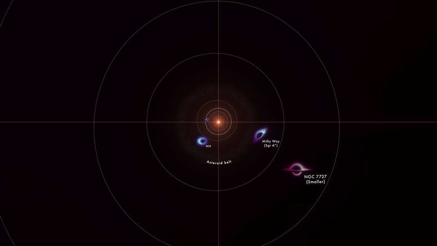 Als nächstes folgt ein Schwarzes Loch aus der Galaxie Zirkul mit einer Masse von 4 Millionen Sonnen. Es hat eine Größe (unter Berücksichtigung des Schattens), die mit dem Radius der Merkurbahn vergleichbar ist. Das Schwarze Loch in der Galaxie M32 ist etwa halb so groß (2,5 Millionen Sonnenmassen), wirkt aber wegen seines Schattens größer.