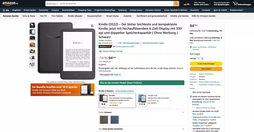 Amazon verkauft den Kindle E-Reader (2022) für check price on amazon. Das Gerät kam letzten Herbst auf den Markt. Es verfügt über ein 6-Zoll-Display mit Hintergrundbeleuchtung und einer Auflösung von 300 Pixeln pro Zoll sowie über ein Gehäuse mit den Maßen 157,8×108,6×8 mm und einem Gewicht von 158 Gramm.