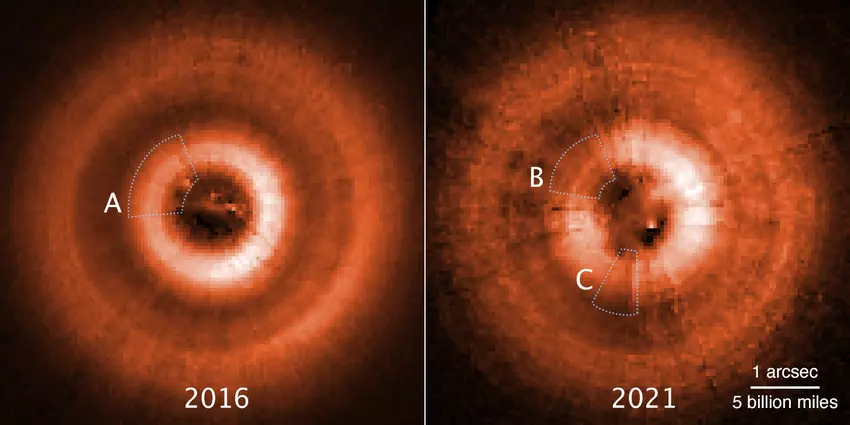 Wissenschaftler haben Bilder aus den Jahren 2016 und 2021 analysiert und sind zu dem Schluss gekommen, dass in einem Sternsystem nicht weit von uns neue Planeten entstehen. Die Bilder wurden vom Hubble-Teleskop in der Umlaufbahn aufgenommen.