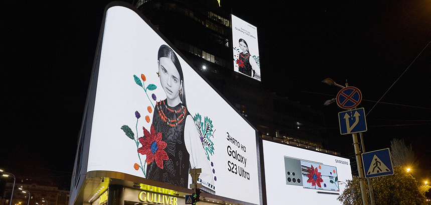 Um die Ergebnisse des Projekts zu demonstrieren, haben wir uns für ultragroße visuelle Flächen in Kiew entschieden - einen der größten Bildschirme in Europa im Gulliver-Einkaufszentrum mit einer Gesamtfläche von etwa 4.000 Metern und eine Markenwand in der Nähe des Eingangs zum Samsung-Markengeschäft in der Nähe der U-Bahn-Station Pochaina.