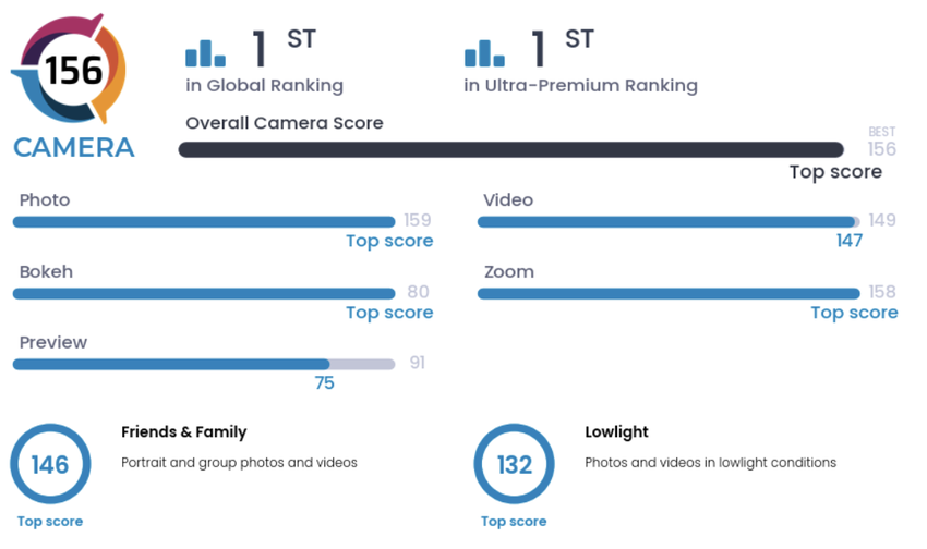 In einer Pressemitteilung von DxOMark heißt es, dass das Smartphone die Rangliste aufgrund seines hervorragenden Zooms und der verbesserten Videoaufnahmequalität im Vergleich zur vorherigen Generation anführt. Der Benchmark ergab 118, 119, 120 und 80 Punkte für Belichtung, Farbe, Autofokus und Hintergrundunschärfe, was einen Rekord darstellt.