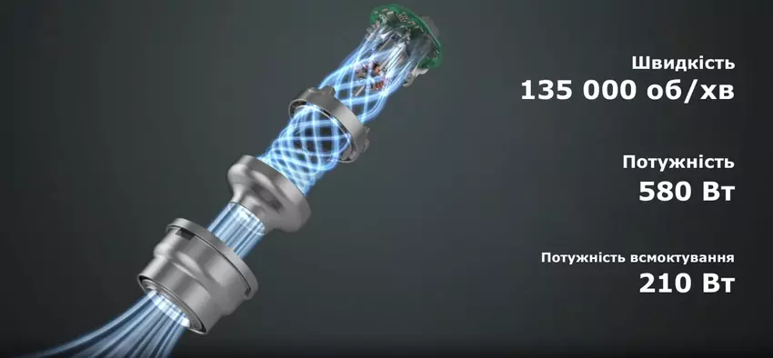 Der Motor des Staubsaugers trägt die Bezeichnung HexaJet-Motor und hat eine Leistung von 580 W, wodurch er bis zu 135.000 Umdrehungen pro Minute erreichen kann. Die Saugleistung erreicht 210 W, was von derselben deutschen Firma getestet wurde.