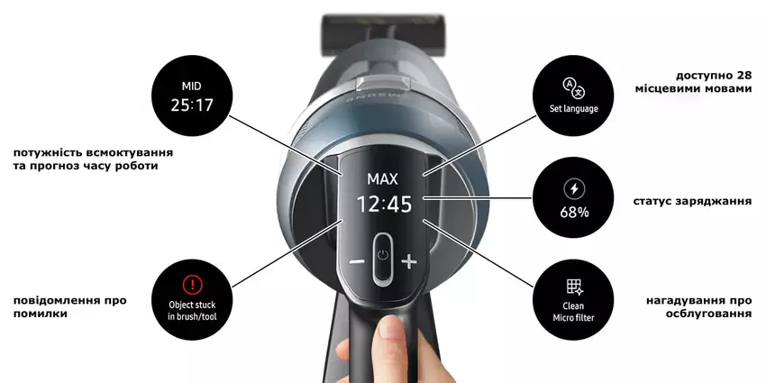 Die Funktionen des Displays sind umfangreicher, als ich erwartet hatte. Erstens zeigt es den Akkustand während des Ladevorgangs an. Zweitens zeigt es den Betriebsmodus (es gibt vier) und die voraussichtliche Akkulaufzeit an. Es wird auch für Servicemeldungen verwendet (z. B. bei einem Betriebsfehler, wenn die Luft verstopft ist und der Schmutz, der die Luft behindert, entfernt werden muss) oder um Sie daran zu erinnern, dass es an der Zeit ist, die Filter zu reinigen. Das Display kann auch für die Nassreinigung verwendet werden, wenn eine geeignete Bürste an den Staubsauger angeschlossen ist.