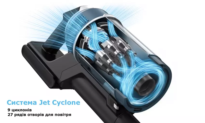 Eine wichtige Filterstufe ist das Jet-Cyclone-System, das mithilfe von 9 Zyklonen Wirbel aus der Luft erzeugt und diese in 27 Reihen angeordnete Löcher leitet. Nach Angaben des Herstellers trägt dies zu einer effizienteren Reinigung bei, da diese besondere Konstruktion die Saugkraft erhöht und eine bessere Reinigung gewährleistet.