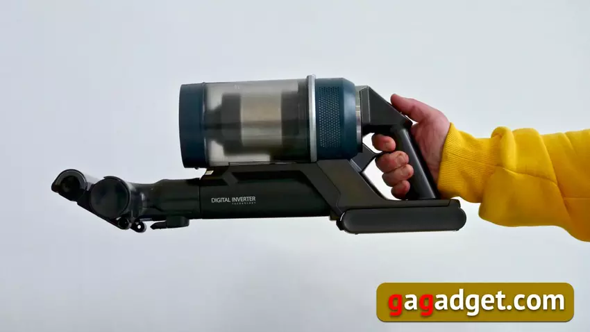 Wenn Sie schon einmal einen kabellosen Staubsauger gesehen haben, wird Sie das Aussehen des Samsung Bespoke Jet nicht überraschen, denn es basiert auf einem bekannten Design: ein Griff mit Motor, ein durchsichtiger, abnehmbarer Behälter (er kann gewaschen werden) und ein Luftansaugrohr mit Aufsätzen und Bedienelementen darunter. Unter dem Griff befindet sich eine herausnehmbare Batterie, darüber ein Display mit Bedientasten.