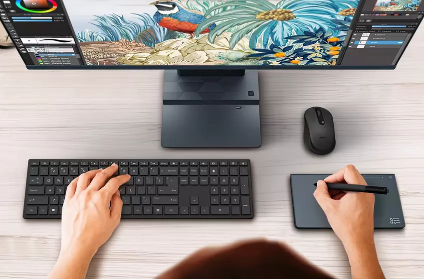 Der Monoblock kommt mit Stereolautsprechern, einem Fingerabdruckscanner, Wi-Fi 6E, Bluetooth 5, HDMI, USB-C und USB-A (x2) Anschlüssen. Eine kabellose Tastatur und Maus sind im Lieferumfang enthalten.