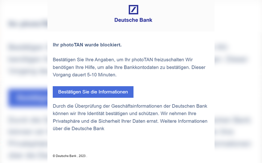 Deutschlands Banken sind weiterhin Ziel von Betrugsversuchen, und in dieser Woche wurden besonders häufig Phishing-Mails an Kunden der Deutschen Bank versandt. Diese betrügerischen E-Mails tragen den Betreff "Ihr photoTAN wurde blockiert" und behaupten, dass die photoTAN deaktiviert wurde. Die E-Mails geben vor, den Kundenanweisungen zur erneuten Freischaltung dieses Dienstes zu folgen. Dabei wird aufgefordert, die Bankkontodaten zu bestätigen. Die Verfasser der E-Mails betonen, dass dieser Vorgang nur 5-10 Minuten dauert.