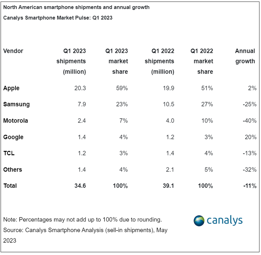 Google hingegen konnte seine Verkäufe um 20 % auf 1,4 Millionen steigern. TCL war ebenfalls unter den ersten fünf. Alle anderen Unternehmen lieferten insgesamt 1,4 Millionen Smartphones aus, ein Drittel weniger als im Basiszeitraum. Ihr Gesamtanteil lag bei 4 %, wovon etwa die Hälfte auf Nokia und OnePlus entfiel. Insgesamt ist der nordamerikanische Markt um 11 % gesunken. Die Auslieferungen fielen von 39,1 Millionen auf 34,6 Millionen Smartphones.