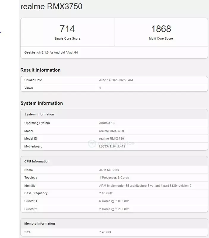 Eines der Modelle der neuen Serie wurde in der Geekbench-Leistungstest-Datenbank gesichtet. Die Rede ist vom Realme Narzo 60 mit der Modellnummer RMX3750. Laut dem Leak wird das Gadget von einem Octa-Core MediaTek Dimensity 6020 Prozessor angetrieben werden. Abgesehen davon wird die Neuheit 8 GB RAM und Android 13 als Betriebssystem haben.
