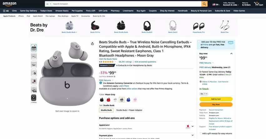 Die Beats Studio Buds sind ebenfalls mit einem Preisnachlass erhältlich - $99.95 $149.95, -33%. Sie sind in sechs Farben erhältlich. Das Modell verfügt außerdem über ein Vakuumdesign und eine aktive Geräuschunterdrückung (ANC). Die Ohrstöpsel werden von einem MediaTek-Prozessor angetrieben. Das Gerät ist nach IPX4 gegen Wasser und Schweiß geschützt, verfügt über einen Näherungssensor und lässt sich schnell mit Android- und iOS-Smartphones koppeln.