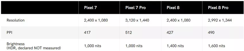 Darüber hinaus hat sich Google beim Pixel 8 Pro für eine etwas geringere Auflösung von 2992×1344 statt des alten Standards von 3120×1440 entschieden, was eine Pixeldichte pro Zoll (PPI) von 490 gegenüber 512 ergibt. Und die Spitzenhelligkeit soll erhöht werden, wobei das Pixel 8 bei HDR-Inhalten 1.400 nits statt 1.000 nits und das Pixel 8 Pro bis zu 1.600 nits in HDR erreichen soll, im Vergleich zu 1.000 nits beim Pixel 7 Pro.
