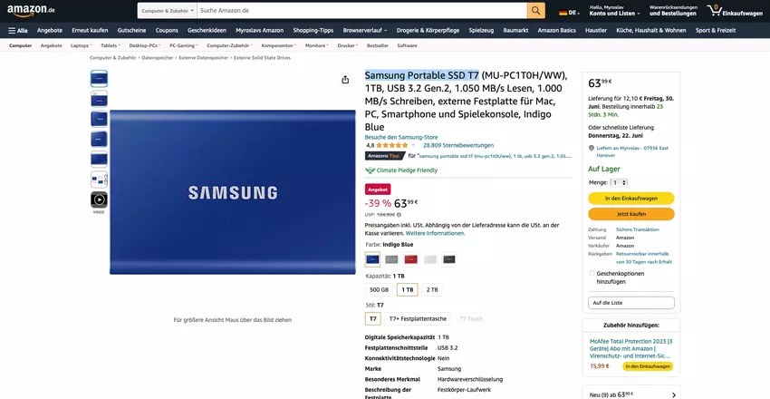 Wir sprechen über das Modell Samsung T7. Das 1TB-Gerät wird für 92,03 € 119,90 €, -23%.